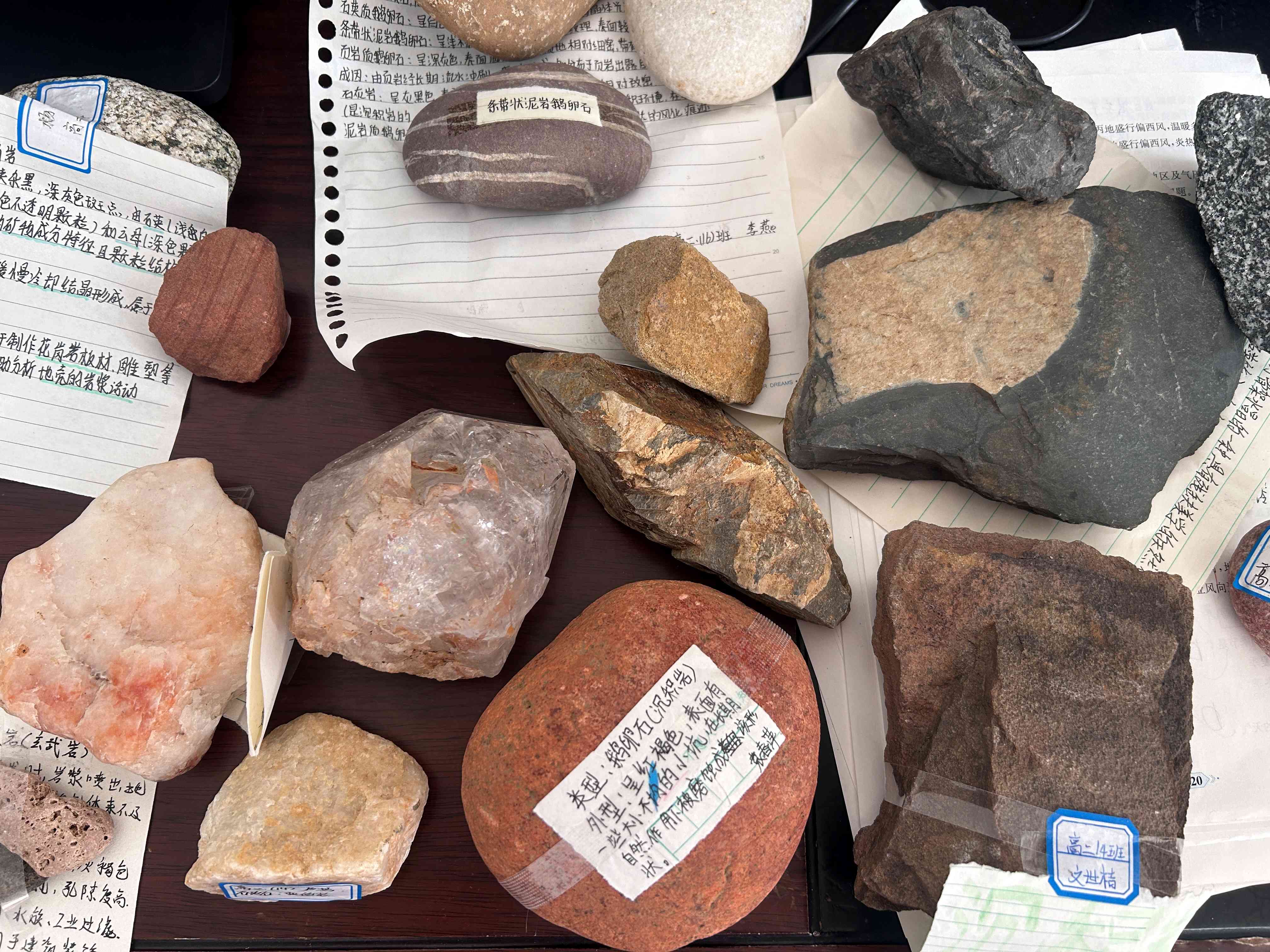 2025年10月,学生们积极参与“捡石头”的活动,其中有12位同学捡的岩石特征典型,纹路、层理清晰,可作为岩石标本展出,且荣获“调研小能手”称号。