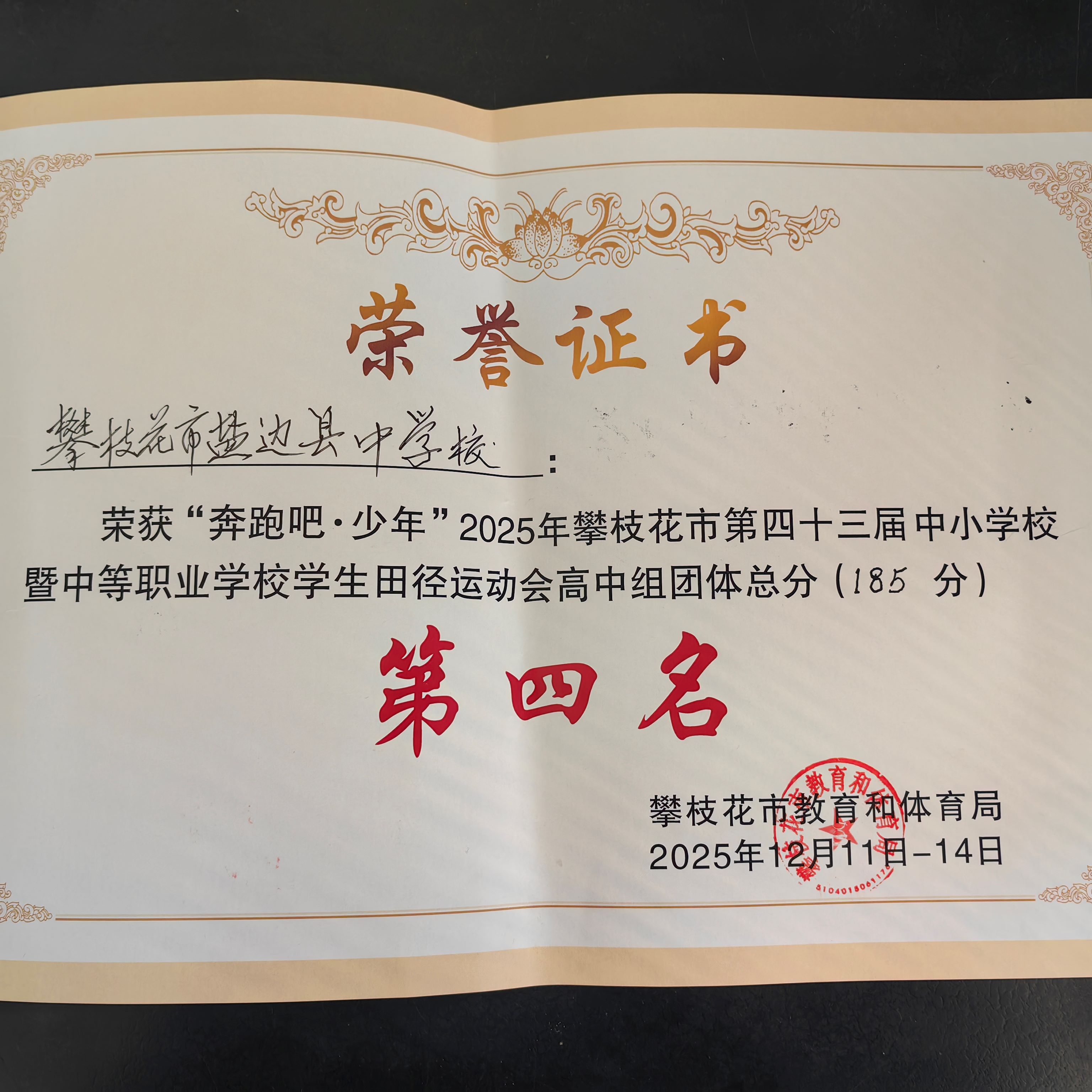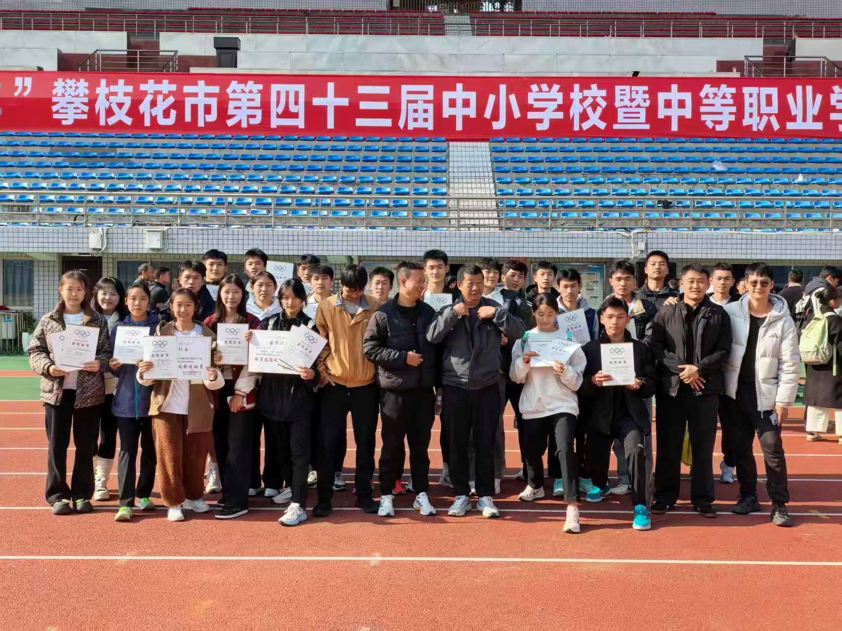 本次运动会中,我校田径队队员发扬顽强拼搏、奋勇争先的体育精神,在多个项目中突破自我、斩获佳绩。最终,我校以5枚金牌、3枚银牌2枚铜牌的优异成绩,荣获团体总分第四名,充分展现了盐边县中学校学子良好的精神风貌和过硬的体育竞技水平。