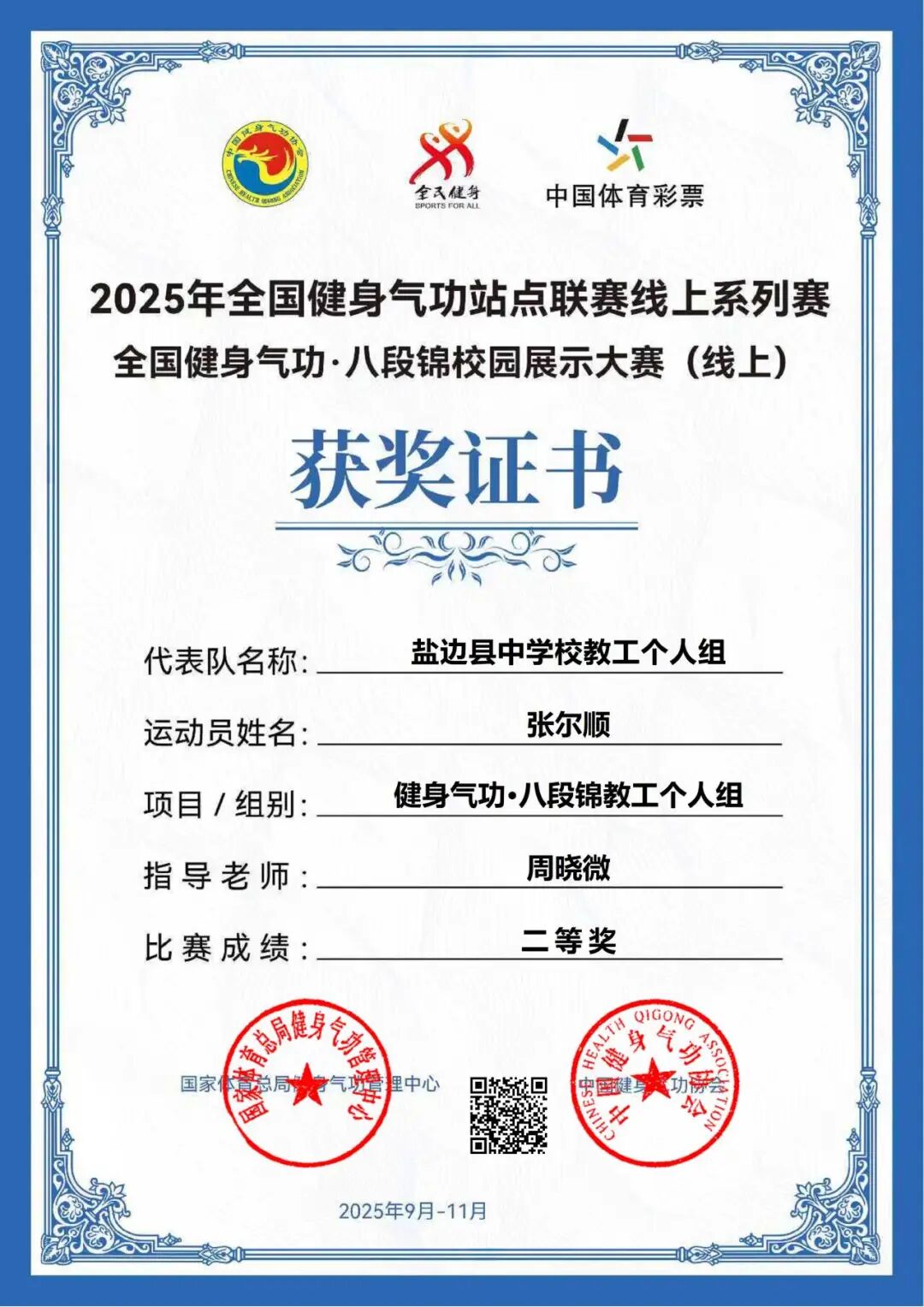 近日,由国家体育总局健身气功管理中心、中国健身气功协会主办的“2025年全国健身气功站点联赛线上系列赛——全国健身气功·八段锦校园展示大赛(线上)”落下帷幕,盐边县中学校师生凭借精湛的功法技艺与默契协作,在全国赛事中脱颖而出,一举摘得1项团体铜奖、3项二等奖、1项三等奖,展现了学校在传统体育文化传承与校园体育建设中的突出成效。